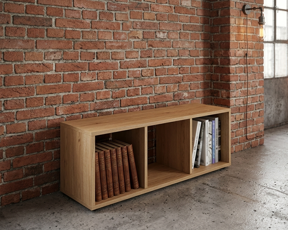 Niski modułowy regał jest idealny do przechowywania książek, butów, zabawek i innych przedmiotów codziennego użytku. Wykonany z wysokiej jakości płyty laminowanej o grubości 18 mm w kolorze evoke i strukturze imitującej dąb. Mebel charakteryzuje się trwałością i łatwością samodzielnego montażu. Minimalistyczna budowa regału sprawia, że doskonale komponuje się z różnymi stylami wnętrz, dodając im nowoczesnego uroku. Jego uniwersalny design umożliwia przechowywanie różnorodnych przedmiotów, od książek i butów po drobne akcesoria czy dekoracje.