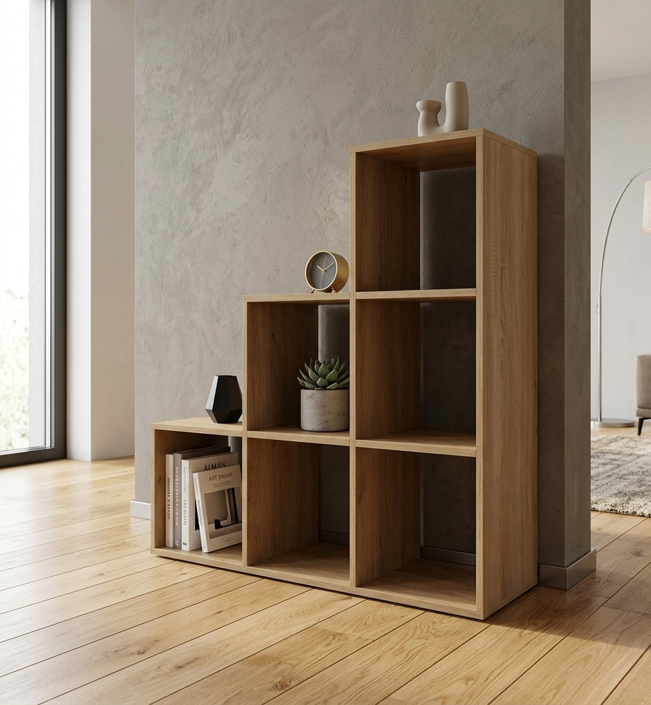 Regał schodkowy wykonany z wysokiej jakości płyty laminowanej drewnopodobnej to nowoczesne i funkcjonalne rozwiązanie, które idealnie wpasuje się w każde współczesne wnętrze. Jego wykończenie wiernie oddaje urok naturalnego drewna dębowego, jednocześnie będąc trwałym i odpornym na uszkodzenia. Modułowa konstrukcja umożliwia elastyczne dostosowanie do indywidualnych potrzeb i wymagań przestrzennych, oferując szerokie możliwości konfiguracji z innymi regałami z naszej serii.
