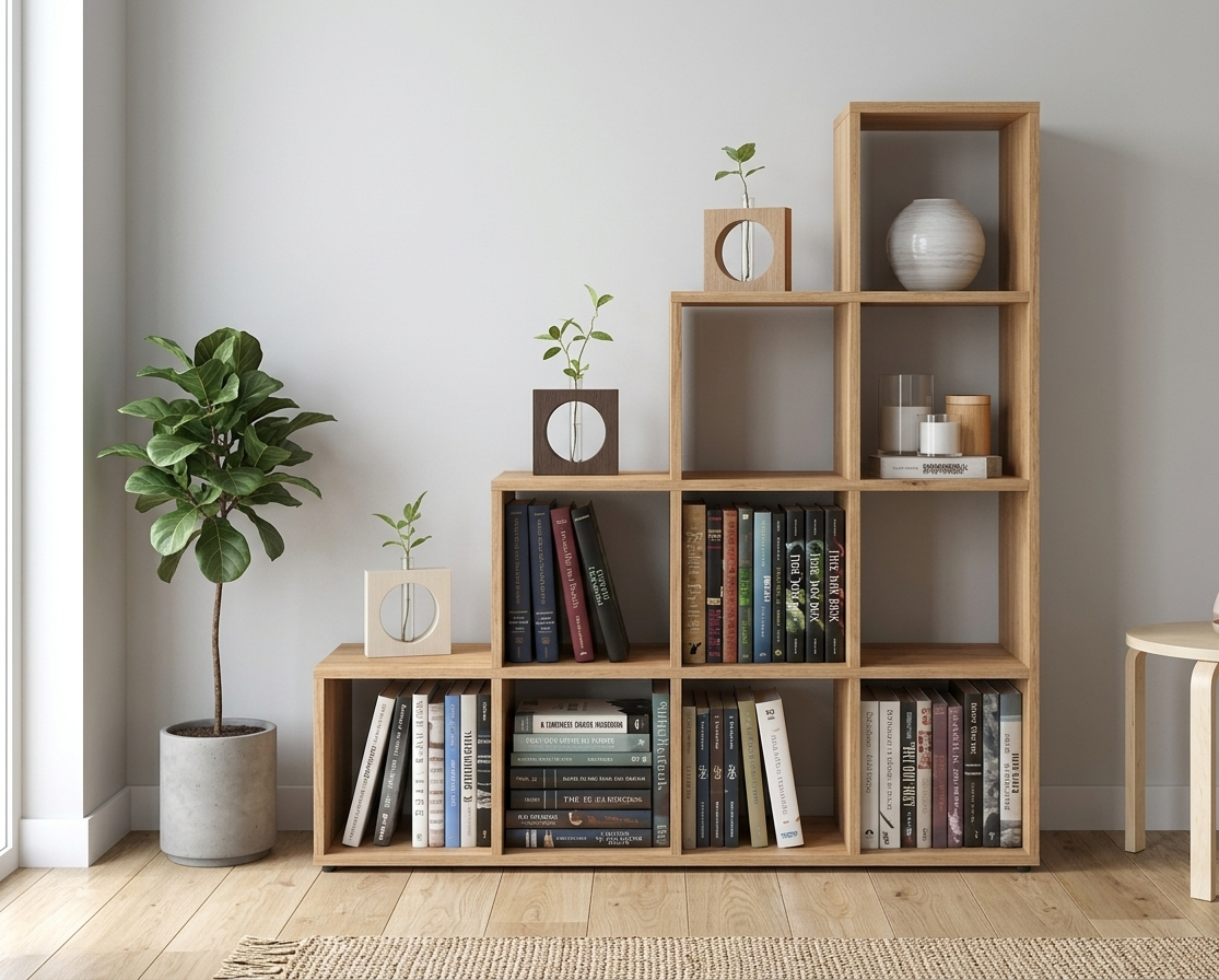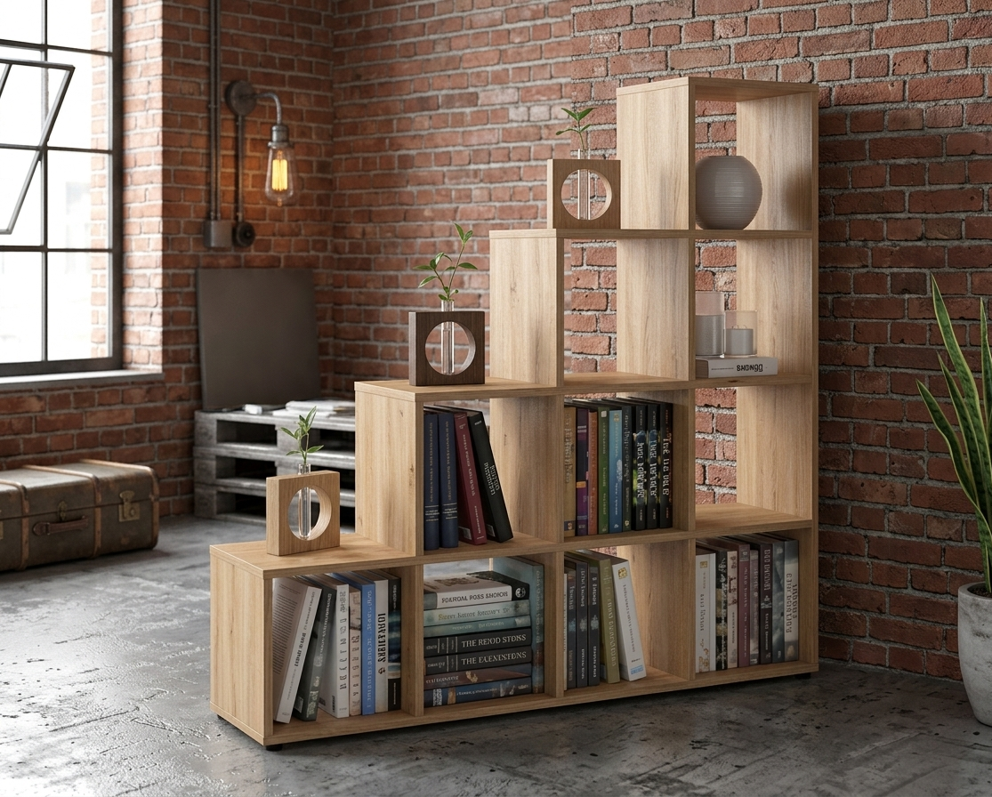 Regał schodkowy z kolekcji modułowej jest uniwersalnym meblem, który doskonale sprawdzi się w różnych pomieszczeniach: